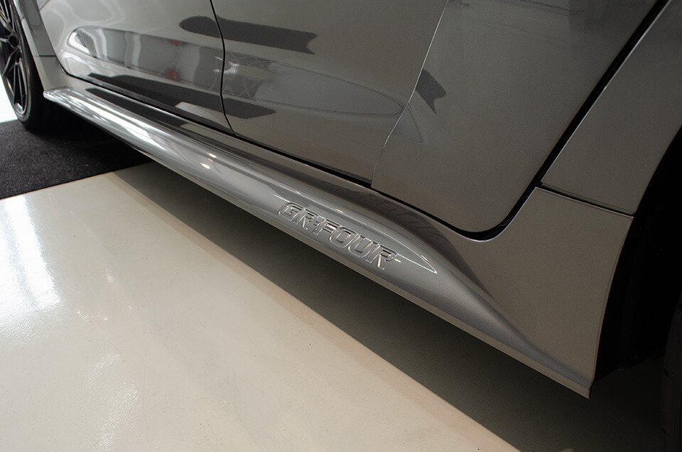GRカローラはロッカーパネルにGR-FOURの文字が加工されていますが、この文字をくり抜くようにカットデータが存在し、文字以外のところを綺麗にプロテクションフィルムを貼ることができました。